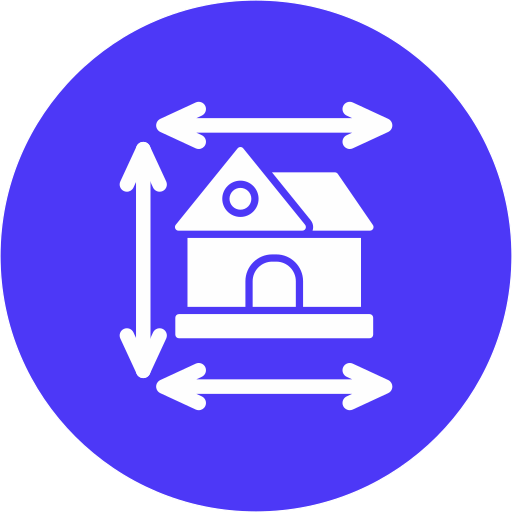 Icon of a house with arrows indicating dimension measurements in all directions, on a purple background.